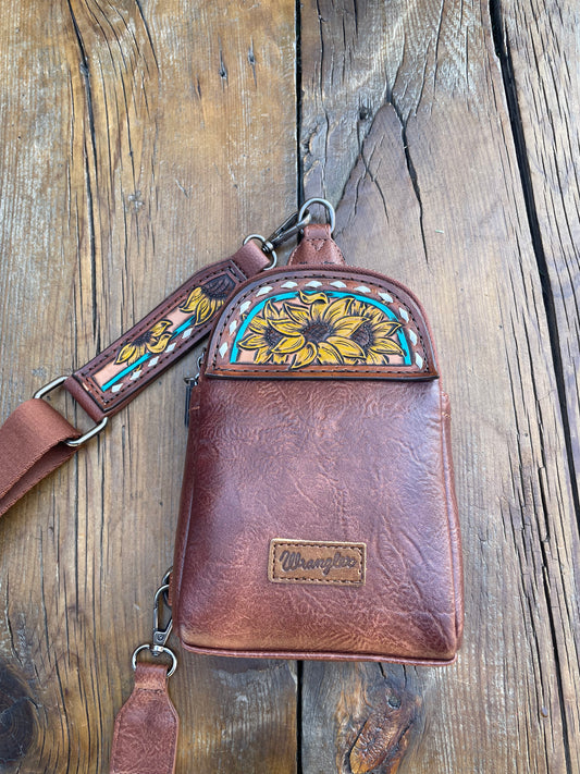 Small sling crossbody bag - brown with turquoise