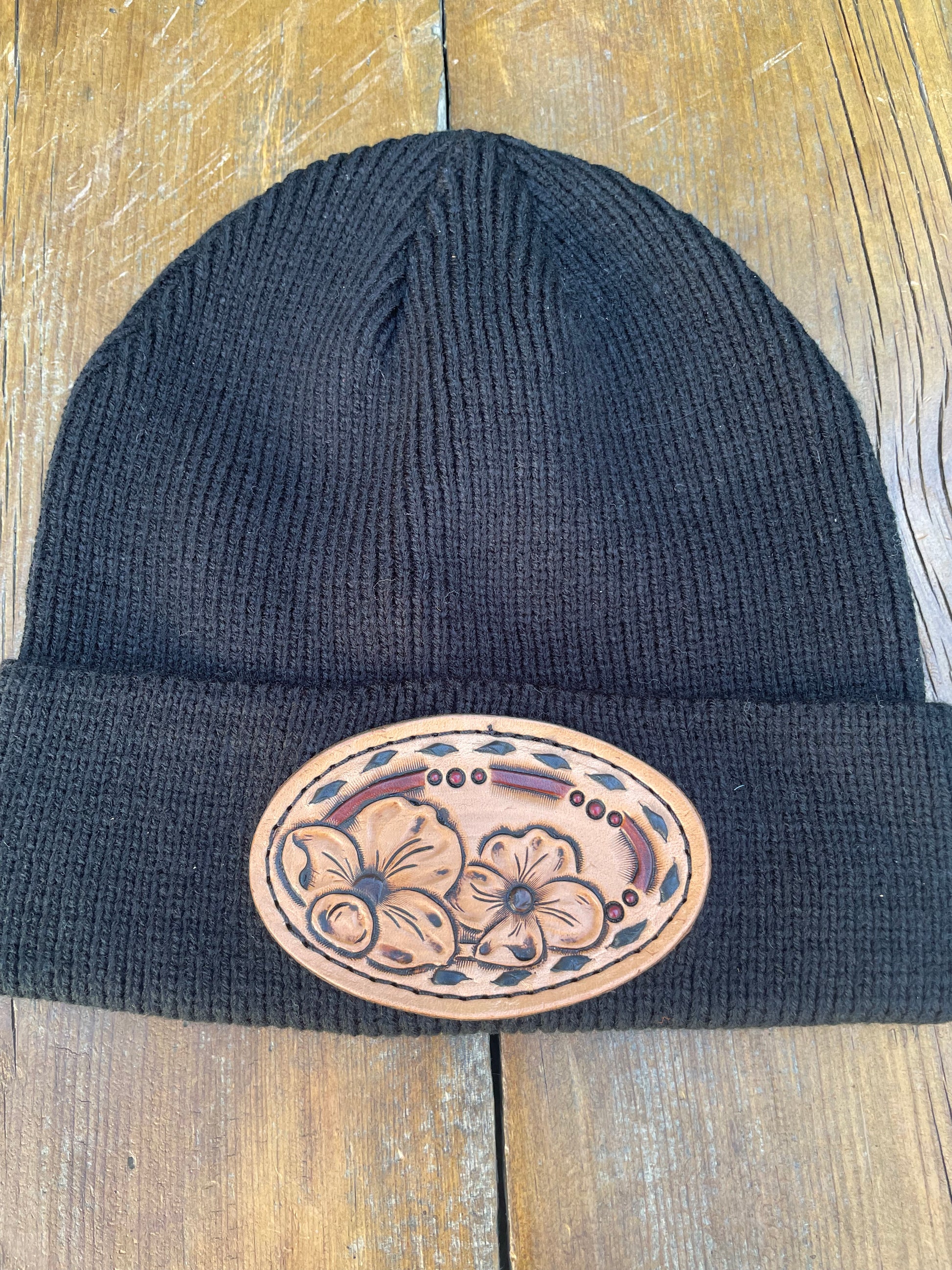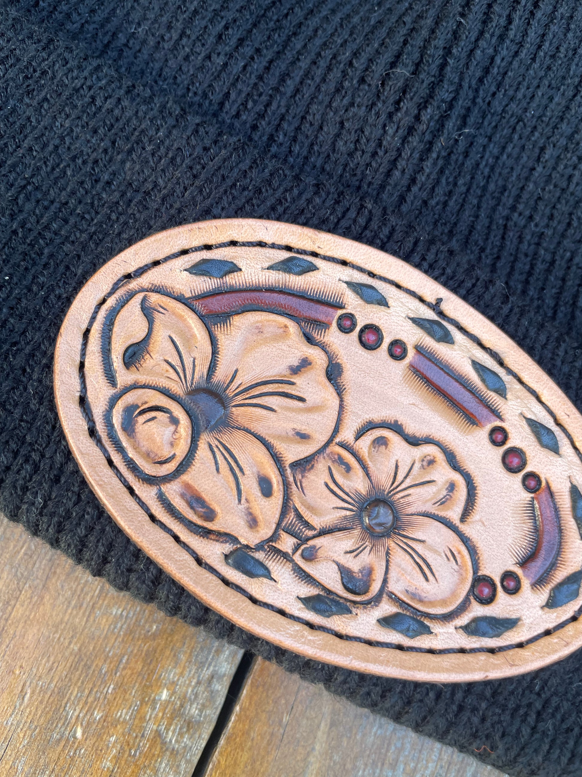 Black beanie with Hand tooled leather patch with flowers and black buck stitch