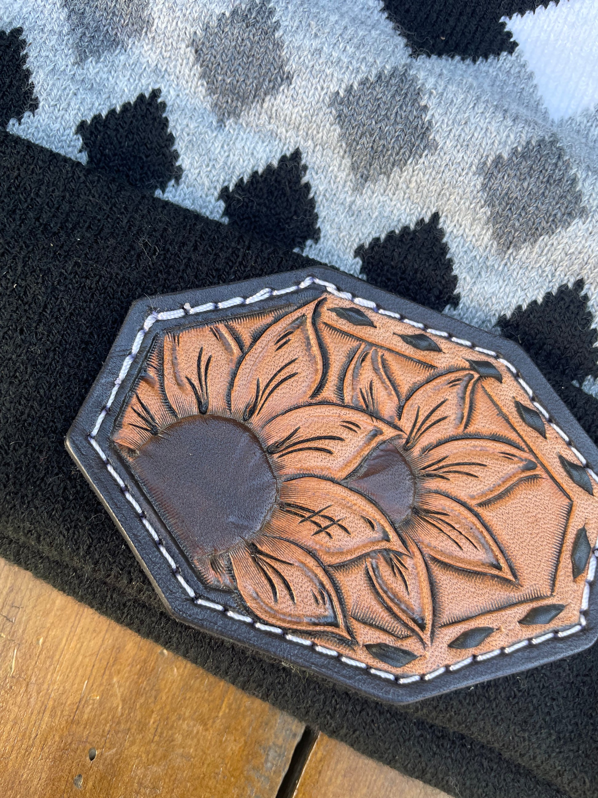 Black and gray beanie with Pom Pom and soft fuzzy liner. Hand tooled leather patch with sunflowers and buck stitch