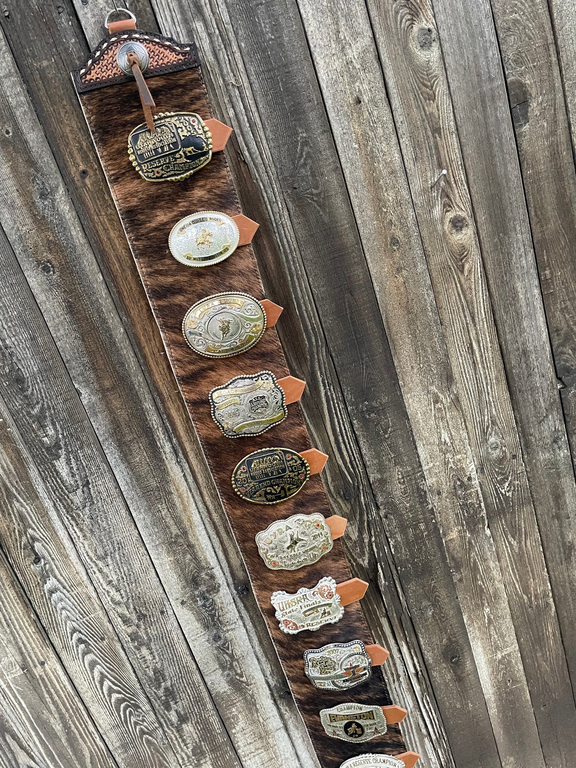 holds up to 10 buckles with basket weave tooled top and bottom with slotted conchos