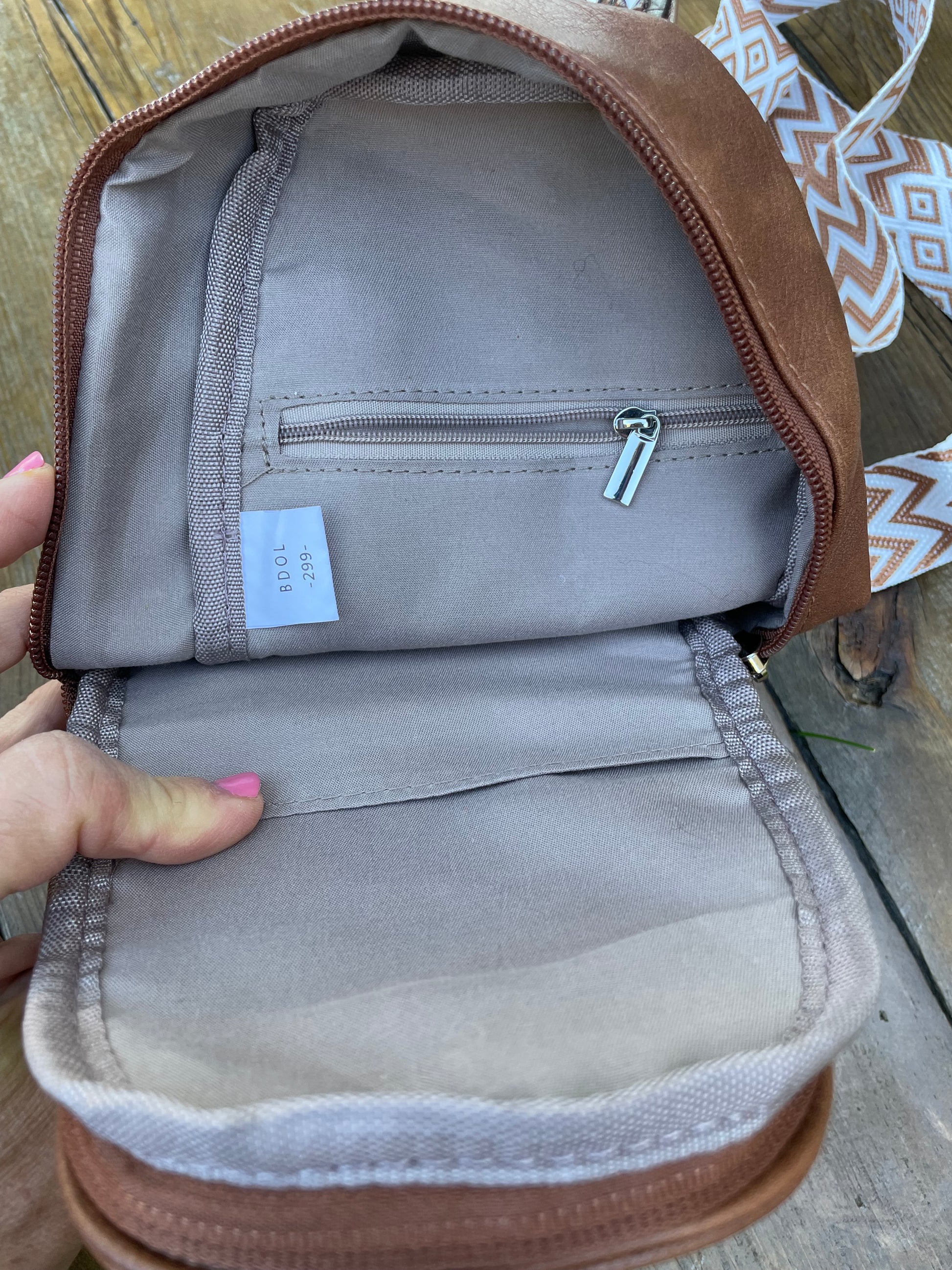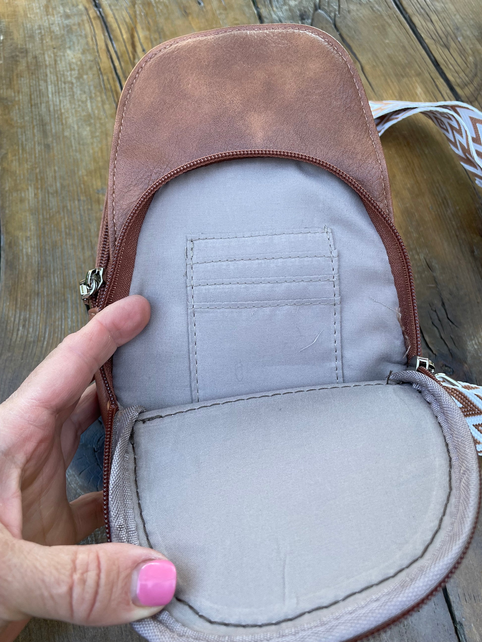 Brown leather bag with 2 zipper compartments. One has 3 card pockets the other has 1 open pocket. Middle open pocket with magnetic snap closure. Vertical zipper pocket on the back. D rings on both sides for left or right shoulder.