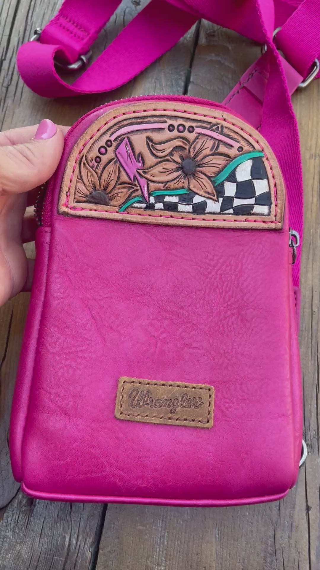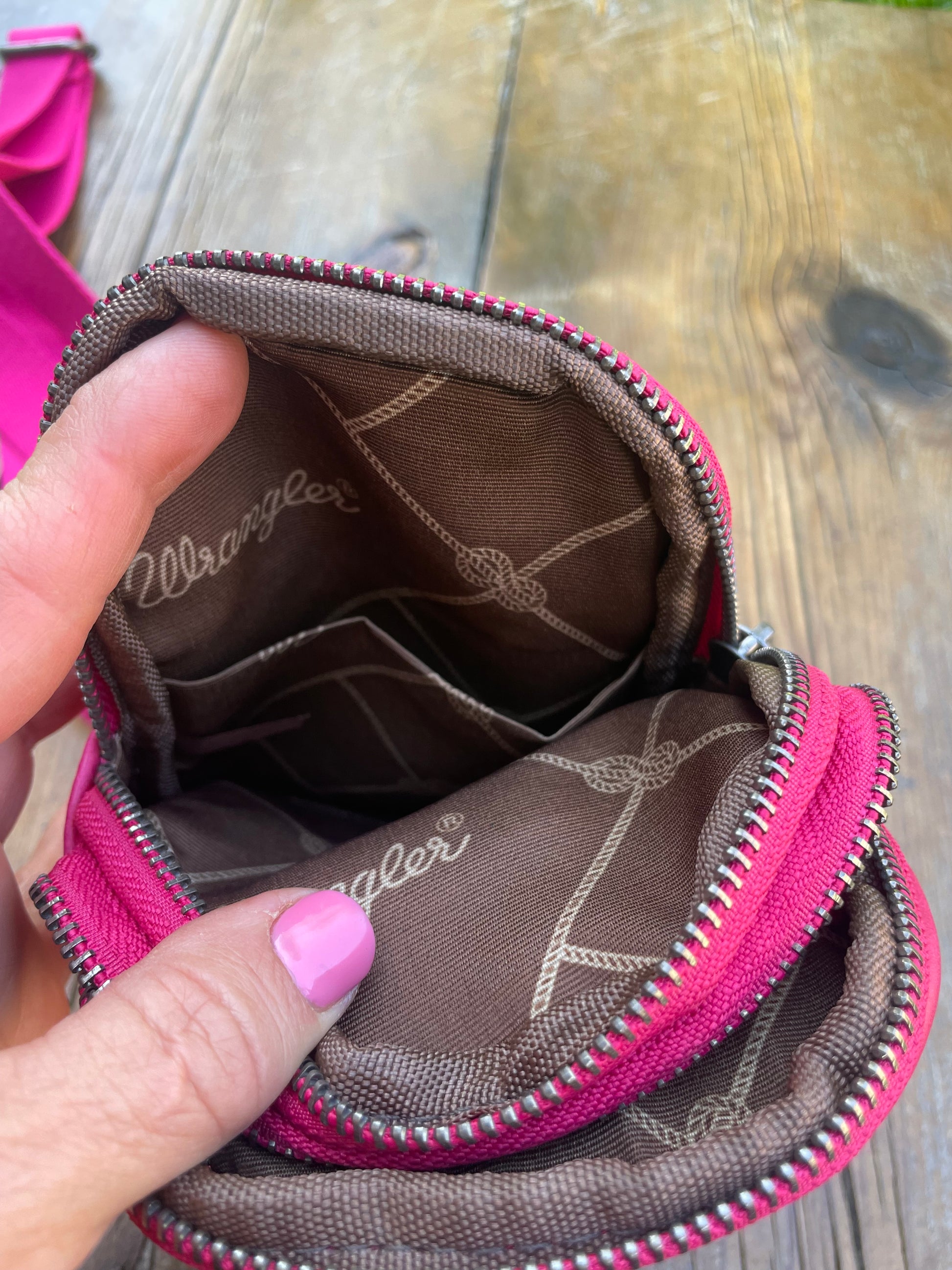 Pink leather bag with 2 zipper compartments. One has 3 card pockets the other has 1 open pocket. Vertical zipper pocket on the back. D rings on both sides for left or right shoulder.