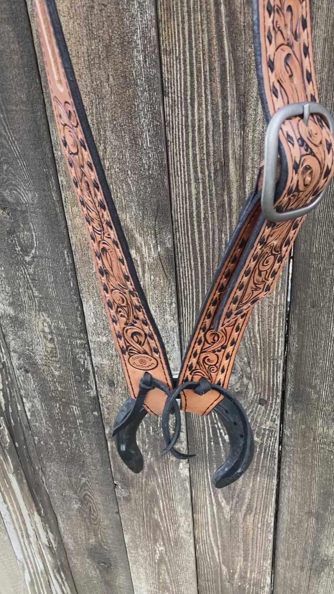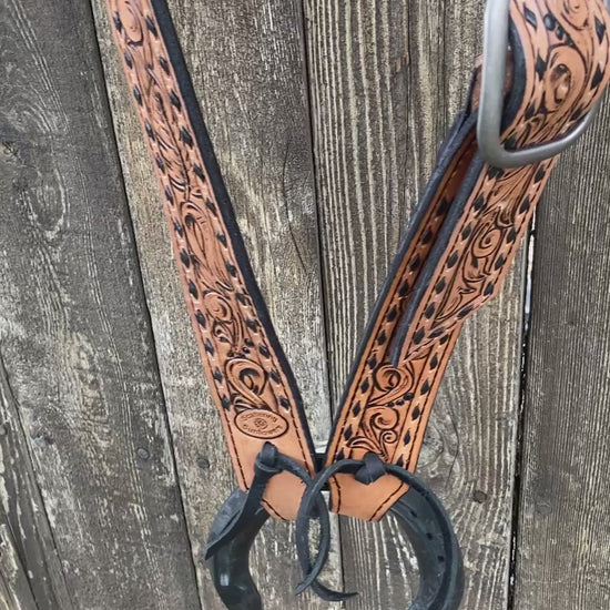 Hand tooled split ear headstall with black buck stitch and floral tooling
